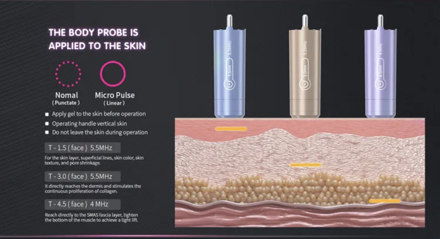 - The 6.0mm, 9.0mm, and 13.0mm are the body transducers, that release ultrasound energy into subcutaneous tissue, tighten skin, and destroy fat cells through micropulsed and normal modes.