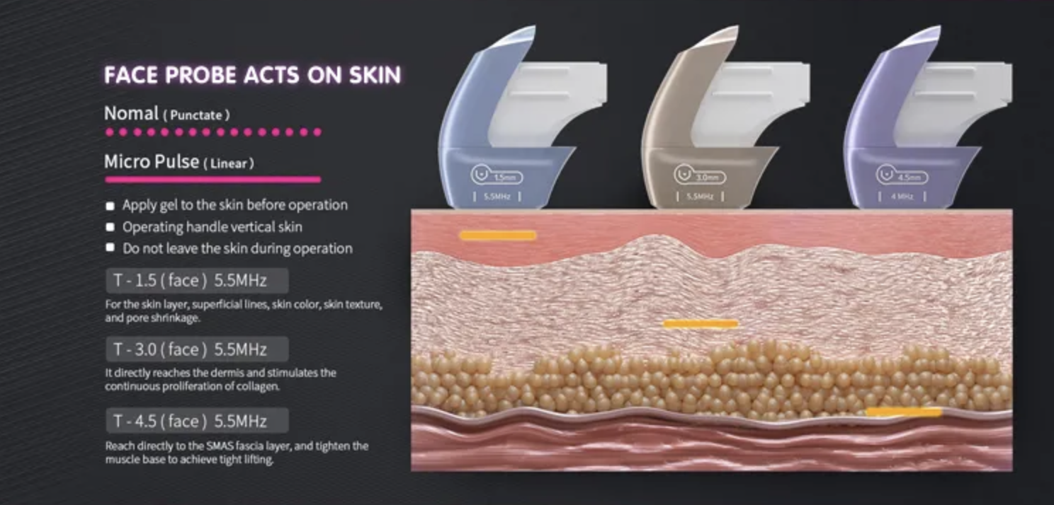 - The 1.5mm, 2.0mm, 3.0mm, and 4.5mm are for Facial. The transducers deliver ultrasound energy into the superficial layers of the musculoaponeurotic system (SMAS) of the face to stimulate collagen remodeling and volume reduction through micropulse and normal modes.