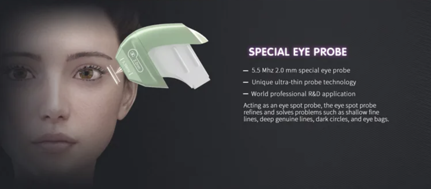 Then, another benefit of 12D HIFU is that it has a 2mm cartridge, which allows us to use it around the eyes, which helps reduce crow’s feet wrinkles and around the eyes. You may also see a more significant effect of raising your eyebrows.