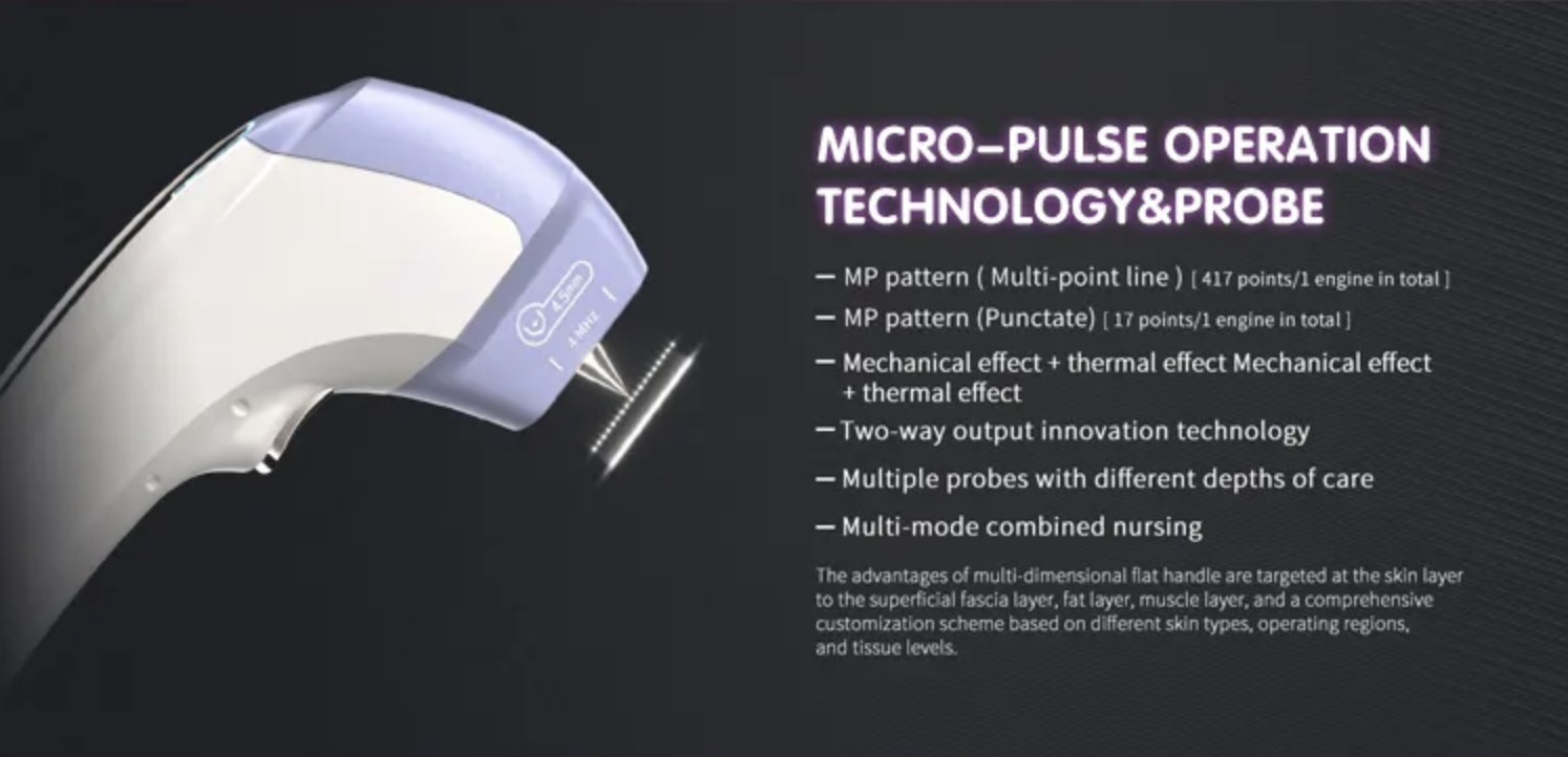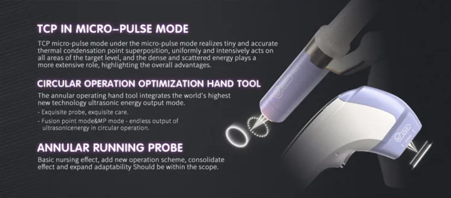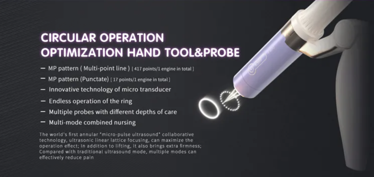 The 12D MPT HIFU uses an ultra-micro pulsed ultrasonic system to instantaneously bi-directionally switch the energy of the Transverse Linear Acoustic Pulse and the Annular Acoustic Wave. It machines the combination of point, line, and surface technology. Achieving a seamless 360° full mode, generating complete anti-aging, lifting, and tightening in multi-layer, with precision, comfortable, fast, and long-lasting effects.